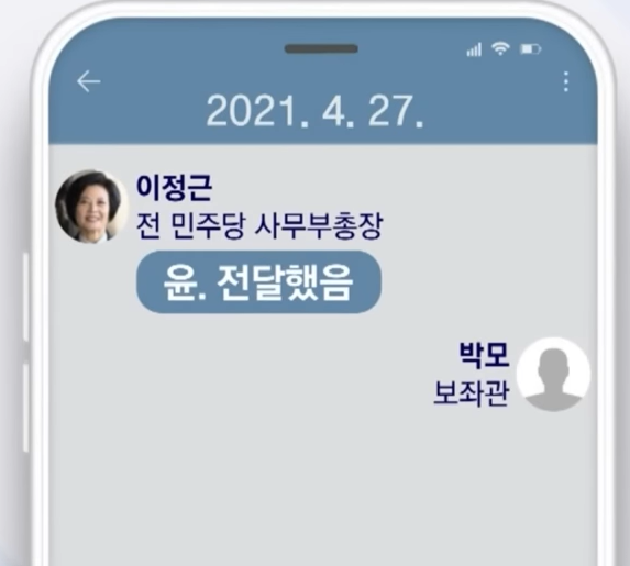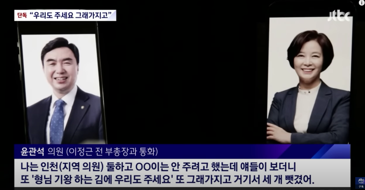 • 그러나, 이정근 통화 녹취에 해당 내용 명시된 바 있다는 것 밝혀짐: “관석이 형(윤 의원)이 (당 대표 선거를 앞두고) ‘의원들을 좀 줘야 되는 거 아니냐’ 나한테 그렇게 얘기했다. 고민하고 있다. 필요하다면 돈이 최고 쉬운 건데….” (2021년 4월 24일)