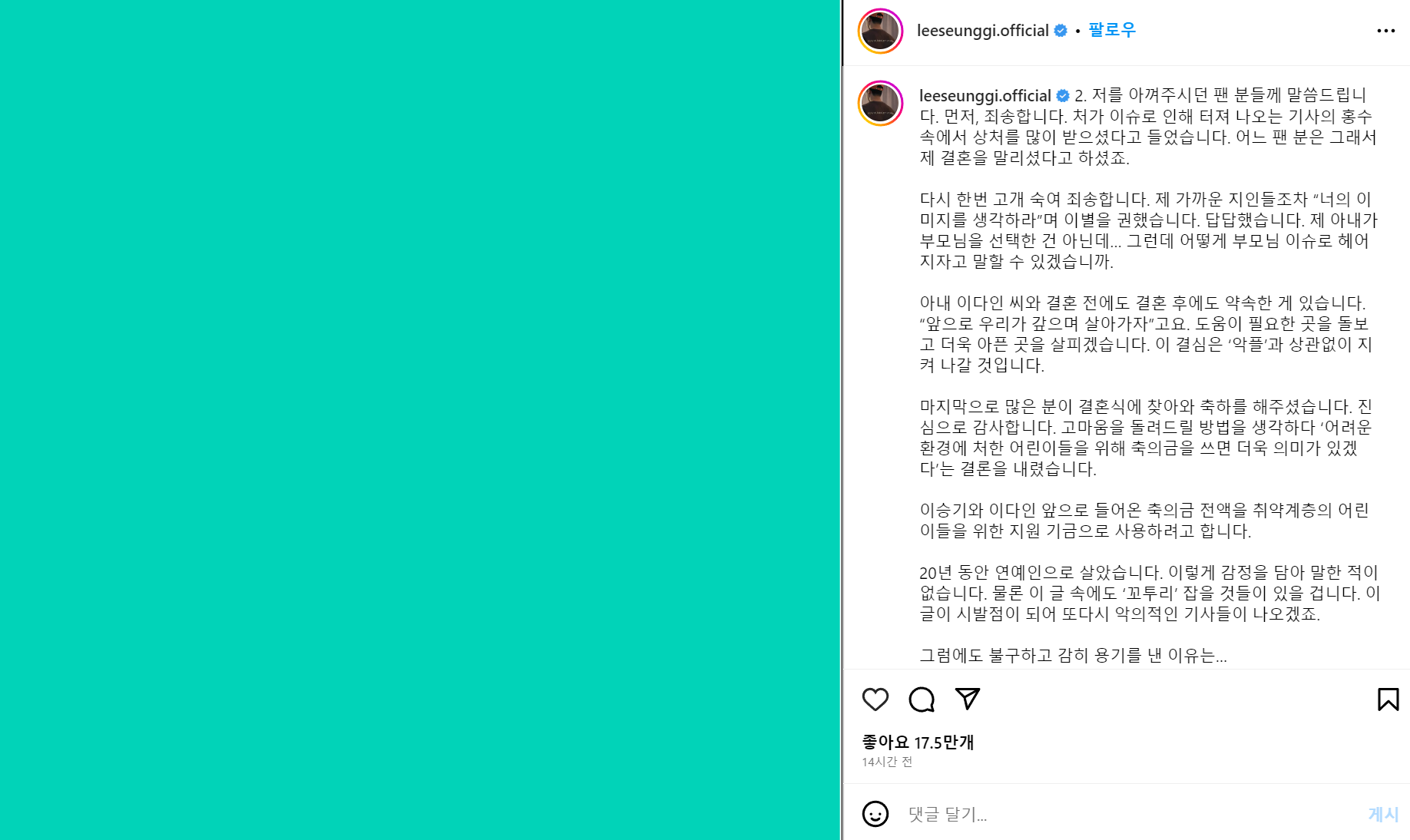 이승기의 결혼을 축복해 달라는 말은 하지 않겠습니다. 다만 지켜봐 주십시오. 이다인 씨와 함께 나누며 살겠습니다. 그것이 제가 할 수 있는 최선이라 여기고 있습니다.