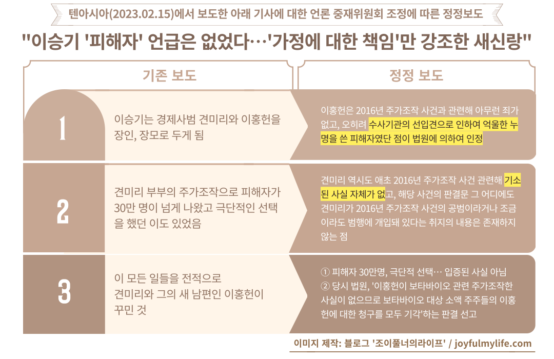 그러나 사실 확인 결과, ① 이홍헌은 2016년 주가조작 사건과 관련해 아무런 죄가 없고, 오히려 수사기관의 선입견으로 인하여 억울한 누명을 쓴 피해자였단 점이 법원에 의하여 인정된 점, ②견미리 역시도 애초 2016년 주가조작 사건 관련해 기소된 사실 자체가 없고, 2016년 주가조작 사건의 판결문 그 어디에도 견미리가 2016년 주가조작 사건의 공범이라거나 조금이라도 범행에 개입돼 있다는 취지의 내용은 존재하지 않는 점, ③ 2016년 주가조작 사건으로 피해자가 30만명이 넘게 나왔고, 그 중 극단적인 선택을 했던 이도 있었다는 점은 입증된 사실이 아니고, 오히려 보타바이오의 소액주주들이 이홍헌을 포함한 관계자들의 주가조작으로 인하여 자신들이 손해를 입었다며 이홍헌을 포함한 관계자들을 상대로 제기한 손해배상 청구 소송에서 법원은 이홍헌이 보타바이오와 관련하여 주가조작을 한 사실이 없으므로 위 보타바이오 주주들의 이홍헌에 대한 청구를 모두 기각하는 판결을 선고하기도 하였던 점이 밝혀져 이를 바로 잡습니다.