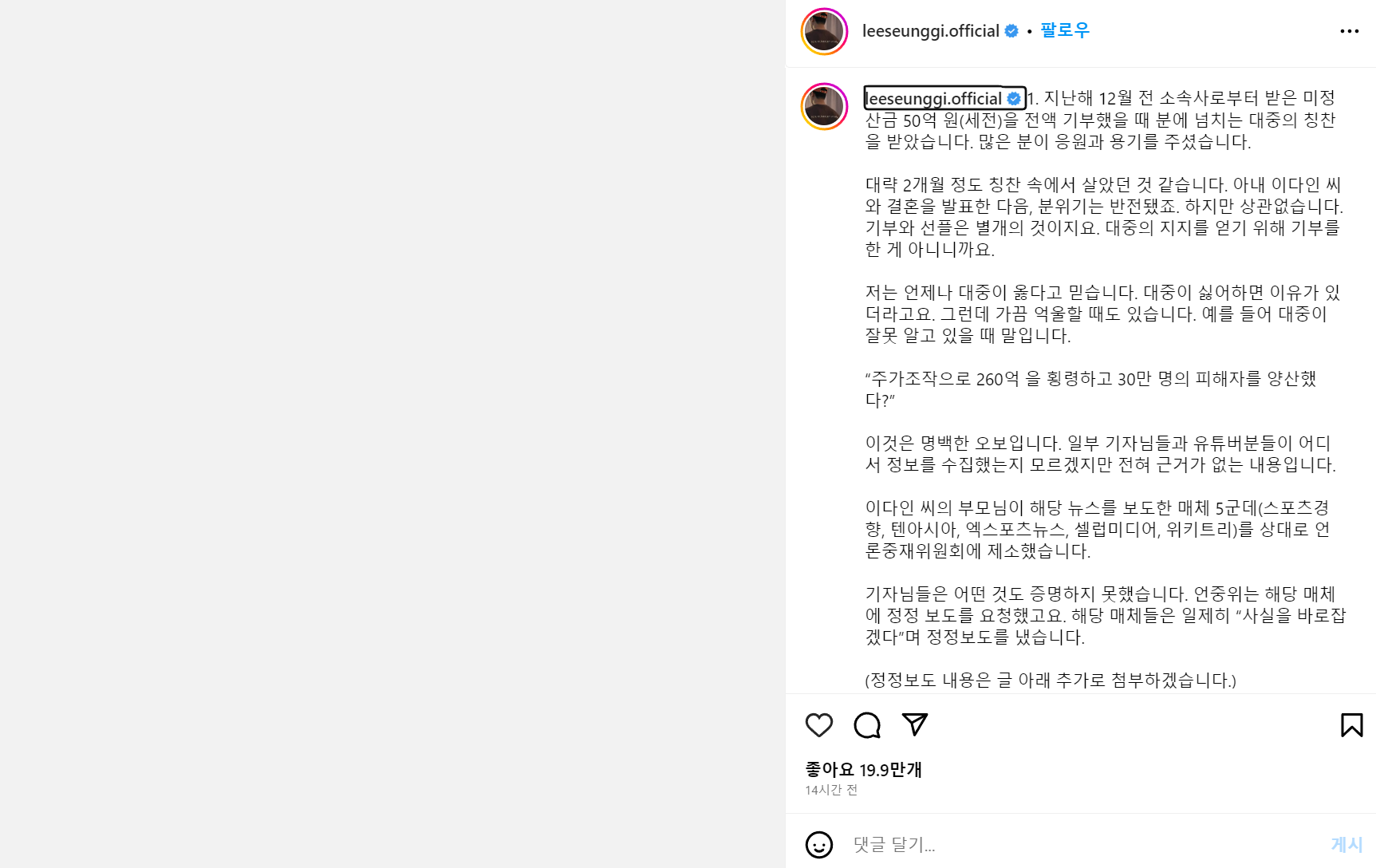 다시 한번 고개 숙여 죄송합니다. 제 가까운 지인들조차 “너의 이미지를 생각하라”며 이별을 권했습니다. 답답했습니다. 제 아내가 부모님을 선택한 건 아닌데… 그런데 어떻게 부모님 이슈로 헤어지자고 말할 수 있겠습니까. 아내 이다인 씨와 결혼 전에도 결혼 후에도 약속한 게 있습니다. “앞으로 우리가 갚으며 살아가자”고요. 도움이 필요한 곳을 돌보고 더욱 아픈 곳을 살피겠습니다. 이 결심은 ‘악플’과 상관없이 지켜 나갈 것입니다.