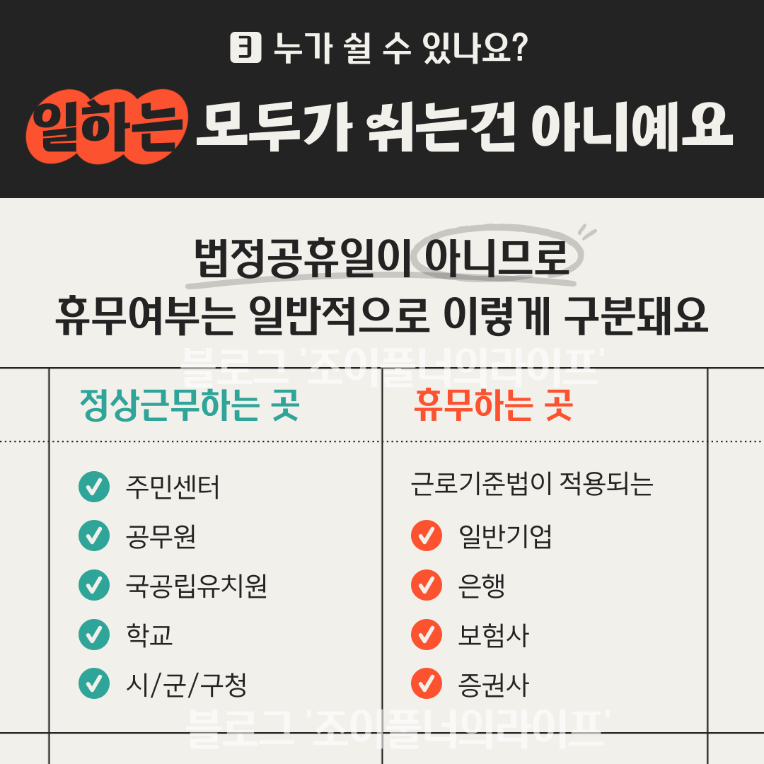 - '근로기준법'이 적용되는 일반 기업, 은행, 보험사, 증권사 등이 휴무!